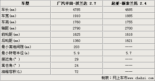 漢蘭達和新索蘭托均屬于一個級別的城市SUV。兩款車型在車身尺寸方面豐田漢蘭達在車長、車寬、車高均超過了起亞新索蘭托,這一點保證了其內部橫向空間及頭部空間的寬敞。在軸距方面,豐田漢蘭達比新索蘭托長出了90mm,這一點意味著漢蘭達的腿部空間將會優越于新索蘭托。豐田漢蘭達的前后輪距和輪胎橫截面數據都要大于新索蘭托,這表明在操控性能上漢蘭達將會略勝一籌。在轉彎半徑上面,起亞新索蘭托僅為5.7m,完全可以適應中國地區道路窄小的特點。