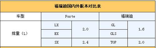 總結:從上面的對比我們發現,Forte國內外兩種版本之間的差異還是很大的,其中動力單元差別最顯著,這主要是由國情和消費能力所決定的。目前國內市場上小排量車型大行其道,尤其是1.6L車型更是炙手可熱,福瑞迪今后的重點也將會落在1.6L車型上,至于2.0L車型更多的將擔負起拉升品牌形象的重任。具體價格車型配置等信息,我們將在上市第一時間為你詳細報道,敬請大家關注!