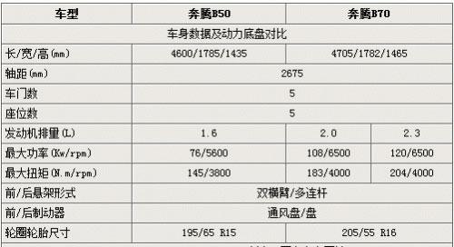 奔騰B50車長4600mm,比同平臺的B70要小近100mm,軸距同為2675mm。而B50的1.6L引擎動力表現要略遜于B70所搭載的2.0與2.3L引擎,但也足夠滿足城市代步的需要。15存的輪胎尺寸也要略小于B70。