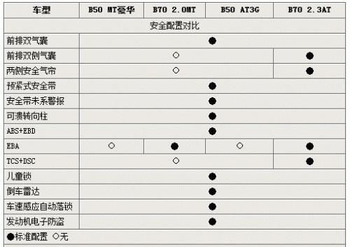 通過此項的對比,可以發現兩款兄弟車型在外觀以及內部的絕大多數配置均極為近似,僅僅是在高配車型之上有了一些不同的豪華系統,如B70 2.3AT豪華車型上的GPS以及DVD系統,還有B50 AT3G版之上的多媒體娛樂系統等等。而B50全息均配備了定速巡航系統,也是新車的一大亮點。