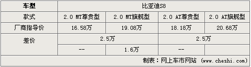 比亞迪S8是國內首款具有硬頂敞篷技術的轎跑車,是比亞迪又一款高端化戰略產品。S8凝聚了比亞迪多年成功的轎車研發經驗,融合了國際汽車制造領域最尖端的汽車科技,全面展現了比亞迪汽車強大的技術實力。其中手動擋或自動擋的尊貴型與旗艦型差價為2.5萬,而手動擋與自動擋車型之間的差價為1.6萬元。