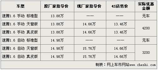 速騰作為一汽大眾新一代“A級”車生產(chǎn)平臺(tái)的產(chǎn)物,上市當(dāng)初憑借全系車型標(biāo)配ESP電子穩(wěn)定程序而成為統(tǒng)計(jì)標(biāo)桿。隨著國家對1.6及以下排量車型減免一半購置稅政策的出臺(tái),速騰1.6車型更受到消費(fèi)者的追捧。據(jù)網(wǎng)上車市價(jià)格監(jiān)測系統(tǒng)顯示,速騰1.6排量全系車型廠家指導(dǎo)價(jià)格上調(diào),優(yōu)惠幅度降低。相關(guān)車型及價(jià)格如下表所示: