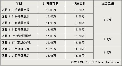 據(jù)經(jīng)銷商銷售人員介紹,速騰1.6L和1.8T冠軍版車型均優(yōu)惠1.2萬元,而2.0L車型優(yōu)惠1.5元達到了全系的最高。1.6L排量車型經(jīng)優(yōu)惠1.2萬元后,入門級的手動天窗版售價降為了12.68萬元,為全系最低價。經(jīng)優(yōu)惠后1.8T的手動型與自動型售價分別降到了16.68萬元和17.88萬元。高排量的2.0L車型經(jīng)優(yōu)惠1.5萬元,手動型和自動型售價分別為14.28萬元及15.48萬元。銷售人員還介紹,店內(nèi)1.6L車型現(xiàn)車較充足,消費者挑選的空間大。