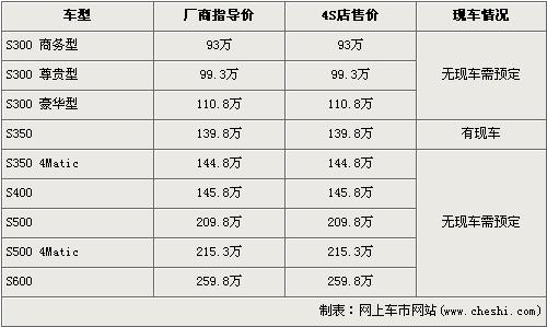 據北京奔馳4S店銷售人員介紹,剛剛上市的奔馳新S級S350L車型店內有現車,欲購買的消費者可以直接從店內提現車。而其他的大部分新S級車型店內無現車,欲購買的消費者需交10萬訂金約等1個月后可提車。