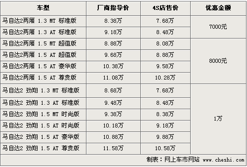 馬自達(dá)2是長安馬自達(dá)繼3系列之后又一定位更加年輕化的城市小車,Mazda2沿襲馬自達(dá)經(jīng)典的“Zoom-Zoom”設(shè)計(jì)理念,并同時(shí)結(jié)合了優(yōu)異的安全性、舒適性及燃油經(jīng)濟(jì)性表現(xiàn)。根據(jù)網(wǎng)上車市價(jià)格監(jiān)測系統(tǒng)顯示,目前全系最高可優(yōu)惠現(xiàn)金1萬元左右,具體行情如下: