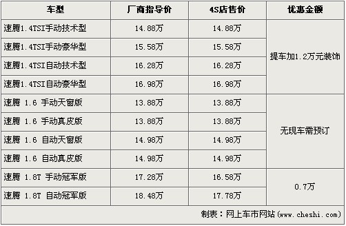 據一汽大眾4S店銷售人員介紹,店內有速騰最新上市的1.4TSI車型現車,并且近期購買1.4TSI的消費者需加裝價值1.2萬元的裝飾才可提車。1.6L車型全部沒有現車,欲購買者需交訂金1萬元,約等2個月才可提車。近期購買1.8T車型的消費者可以得到7000元的現金優惠。