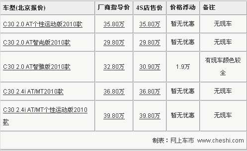 沃爾沃旗下的豪華轎跑車全新改款C30已于3月18日正式在中國上市,憑借著時尚的外觀設計和沃爾沃的品牌影響力,自上市以來受到了廣泛關注。近日網上車市記者也從沃爾沃北京經銷商處了解到,目前C30最高優惠1.9萬元,詳情參考下表:
