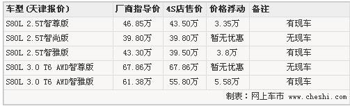 據天津中汽南方沃爾沃4S店的銷售人員介紹,目前除了入門級2.5T智尚版與頂級配置的3.0 T6 AWD智尊版兩款車型無現車之外,其它3款車型分別有不同程度的優惠,熱銷車型 2.5T智尊版的售價已經跌至40萬元以下,而3.0 T6 AWD智雅版的優惠幅度達到了近6萬元。現車以黑色以及銀色居多,其它顏色預定等待一個月左右。