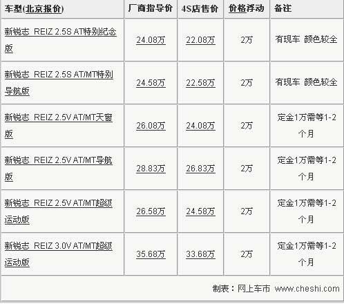 據北京一汽豐田4S店銷售人員介紹,目前銳志全系優惠2萬元,銳志 REIZ 2.5S AT特別紀念和2.5S AT/MT特別導航版有現車供應,且顏色較全,其余高配車型均需要預定。銷售人員還表示:現車的顏色有銀、白、黑、紅可供選擇,有現車的這兩款車型是豐田銳志賣的最火的也是性價比最高的兩款車型。消費者交定金1萬等待1-2個月便可提車。北京地區各4S店由于訂單不同,各店銷售的現車顏色有所不同。