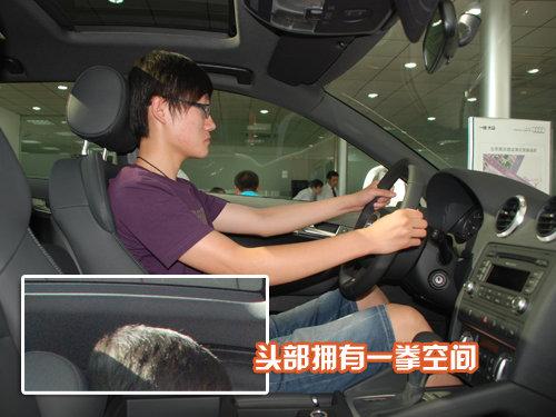A3算是奧迪家族里面身材最為迷你的一位成員了,三圍參數:4292mm*1765mm*1423mm,軸距為2578mm,絕對的緊湊級身材。視覺從車外直觀看過去,相對低矮的車身有點擔心空間的問題,測試者178CM。