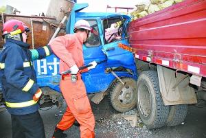 昨天下午5時許,大興區黃村鎮劉村附近,一輛農用四輪車和一輛卡車相撞,農用四輪車上兩人被卡,大興區西紅門消防中隊迅速趕到現場,將被困人員救出,所幸兩人無生命危險。