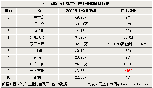 近日,來自汽車工業(yè)協(xié)會(huì)的數(shù)據(jù)顯示,今年1-9月,乘用車?yán)塾?jì)銷量超過720萬輛,比去年全年凈增48.59萬輛,同比增長超過40%,創(chuàng)歷年最高。轎車生產(chǎn)企業(yè)銷量排行前十位的廠商,都獲得了大幅增長當(dāng)然不包括一汽豐田,它比較意外的出現(xiàn)了負(fù)增長,同比下滑了16%,是銷量排行前十位的廠商中唯一下滑的車廠(詳見下表)。