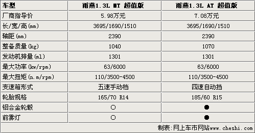 從圖表中可以看到,雨燕的兩款超值版價格相差1.1萬元,在性能和配置方面都有一些不同之處。首先,雨燕超值版的車身尺寸和軸距都沒有任何變化,但自動擋車型的整備質(zhì)量比手動重30kg。另外,在動力搭配相同的情況下,雨燕1.3L AT超值版匹配四速自動變速箱,所以加速和高速行駛的表現(xiàn)不會超過手動擋車型。不過雨燕1.3L AT 超值型采用了15寸輪胎和鋁合金輪轂,而且還配備了手動擋所沒有的前霧燈,其他配置方面并無差異。