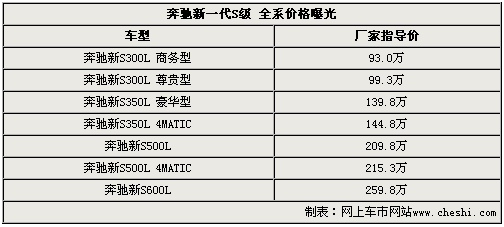 奔馳新一代S級轎車將于今晚在太廟正式上市,首推S300L商務型、S300L尊貴型、S350L豪華型、S350L 4MATIC、S500L、S500L 4MATIC和S600L共計7款車型,售價為93萬元-259.8萬元。而在上海車展全球首發的奔馳新S400L 混合動力車型,未在本次上市車型中出現。具體車型及售價如下表所示: