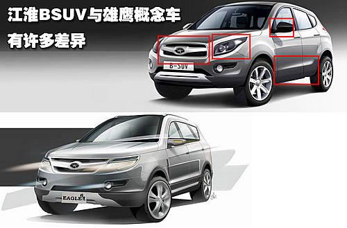 江淮BSUV是以雄鷹概念車為原型打造的一款小型SUV,雖然沒有RAV4那樣的身材,但整車的側面造型和前引擎蓋的線條都與RAV4非常相似,讓人一眼看上去會聯想到縮小了的RAV4。江淮BSUV的外形設計非常動感時尚,相信會迎合國內很多消費者的胃口。