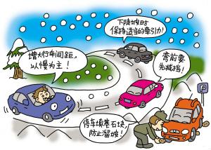 對于雪地的駕駛技巧,交警部門提醒車主,關鍵是以“慢”為主,并與前車保持足夠的剎車距離。然而,路況的復雜,讓很多駕駛員在發生側滑時感到緊張。“如果車輛打滑,方向盤要順著打滑方向輕輕地轉,待車輪回正后,再輕輕地踩剎車。”“關鍵是要慢,平穩地減速及輕踩剎車,絕對不要在冰雪濕滑的路面上猛起步,或緊急剎車。”杭城資深出租車司機師傅們紛紛提供雨雪天氣駕駛竅門。
