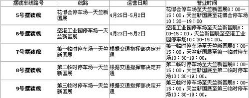 喜歡自駕車的朋友們,新國(guó)展在花博會(huì)設(shè)立了專門(mén)的停車場(chǎng),大家可以把車停到這里然后乘坐車展的擺渡車直接前往展館。擺渡車的路線和運(yùn)營(yíng)時(shí)間如下表: