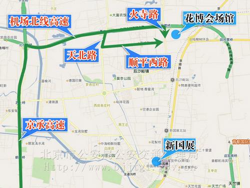 (一)由京承高速路經機場北線高速路、火寺路出口、火寺路;或由機場北線高速路天北路出口經天北路、順平西路至花博會場館自駕車停車場。