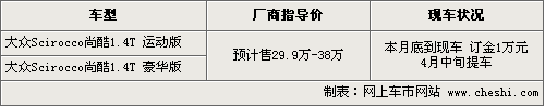 與六代高爾夫同平臺的大眾Scirocco尚酷轎跑車,自從在廣州車展上正式發(fā)布以后,引起眾多車友的極大關注,這款車采用了大眾IROC概念車的大量設計元素,是一款既彰顯時尚前衛(wèi)的運動氣質(zhì)又能滿足駕駛者日常功能需求的全能轎跑車。根據(jù)網(wǎng)上車市價格監(jiān)測系統(tǒng)顯示,目前尚酷展車已經(jīng)到店,本月底現(xiàn)車也將陸續(xù)到店,4S店開始接受消費者預訂,具體行情如下: