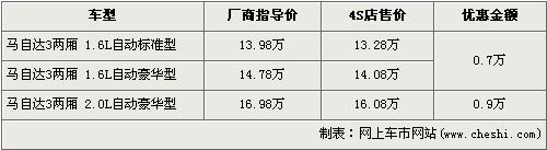 據經銷商處銷售人員介紹,目前馬自達3兩廂有1.6L和2.0L兩種排量共三款車型在售。馬自達3兩廂2.0L車型優惠為9000元,1.6L車型優惠為7000元。經7000元的優惠后,1.6L自動標準型和1.6L自動豪華型售價仍為13.28萬元和14.08萬元,全系最高配的2.0L自動豪華型經9000元的優惠后,售價為16.08萬元。