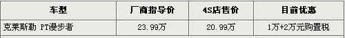 筆者從克萊斯勒北京地區經銷商處了解到,目前PT漫步者這款車只有一款車型在售,售價為23.99萬元,現階段購車的話可以贈送2萬元購置稅,同時4S店內可以有1萬元的現金優惠,優惠后售價近21萬元。在顏色方面,這款車有黑色、銀色、紅色、藍色、灰色等多款可供消費者選擇,目前4S店內顏色不太齊全,個別款還需要消費者預定。