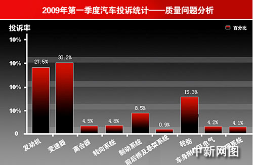 中新網4月24日電 日前,中國質量協會用戶委員會、車人網聯合發布了2009年一季度中國汽車產品質量與服務質量分析報告。統計顯示,本季度的投訴中有關異響和輪胎的投訴仍呈上升趨勢。