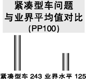 在細(xì)分市場方面,緊湊型車車主遇到的問題比行業(yè)平均水平高出80%以上,比高檔緊湊型車用戶的問題高出58%。幾乎20%的緊湊型車車主都投訴說他們遇到的問題比預(yù)期的要多,而整個(gè)業(yè)界有此抱怨的客戶也不過是10%。除此之外,緊湊型車細(xì)分市場中遇到的產(chǎn)品缺陷和功能障礙數(shù)量(243 PP100)幾乎是業(yè)界總體水平的兩倍(125 PP100)。