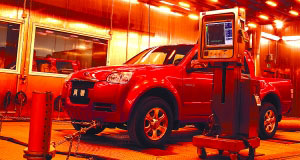 一輛風駿皮卡安靜地停在一間大房子內,天花板上的幾臺高功率射燈讓它看上去光彩照人。但過不了多久,這些大燈就會讓風駿暴露在強烈的“熱帶陽光”之下,接下來,這輛倒霉的實驗車可能還要在模擬行駛的狀態下接受從零上40度到零下60度環境溫度變化的考驗。