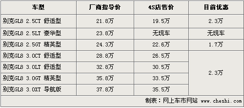 別克GL8是MPV市場一款非常受歡迎的車型,成為公司和商務用車的主要選擇對象,被稱為“陸上公務艙”。根據網上車市價格監測系統顯示,目前這款車的優惠幅度在原來2萬元基礎上增加到了2.3萬元,具體車型以及價格如下: