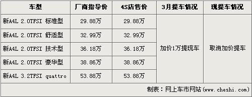 據北京地區奧迪經銷店銷售人員介紹,近期購買奧迪A4L的消費者可以以原廠商指導價購買,提現車不再需要多交1萬元現金。在售的新A4L分為5款車型,售價分別為:2.0T標準型為29.88萬元、2.0T舒適性為32.99萬元、2.0T技術型為36.18萬元、2.0T為38.86萬元、3.2Quattro為53.88萬元。銷售人員還介紹,新A4L的內飾分灰色、黑色和米色三種,一般車色均配以米色和灰色內飾,只有紅色車身的新A4L配以黑色內飾,店內只有紅色車型數量不多,欲購買其他顏色的消費者需交定金1萬元,約等1個月后提車。