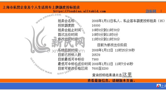 根據競標網友田小姐提供的數據顯示,10時開始,投標的網絡已人滿為患,投標電話爆滿, 10:15分參與競標人數僅有3523人。10:19分參與競標人數3745人;11時修改價格開始,投標人數已增長到25000余人, 11:25:36,最低可中標價為7900元,11:29:38,可最低中標價為8100元。