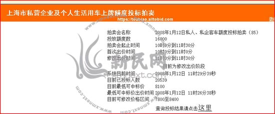 11時30分,本市2008年第一次私人、私營企業客車額度競標結束,新民網薛驍翔從現場發回最新消息稱,本次私車額度平均中標價為23370元,比上月減少32672元,下跌近60%;最低中標價為8100元,比上月足足跌了41900元,投標人共計20539人。