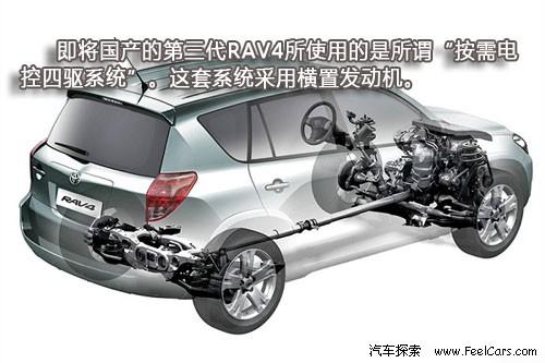 但值得注意的是,之前兩代RAV4采用的都是全時四驅系統,與此相配合發動機也使用了縱置的設計。而即將國產的第三代RAV4所使用的是所謂“按需電控四驅系統”(Electronic On-DeMand 4-wheel drive)。這套系統采用橫置發動機,在需要時通過液力粘性耦合器將動力傳至后輪。