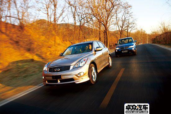 注重舒適絕不代表就會忽略動力與操控性。這是EX35的跨界理念帶給我們最直觀的感受。EX35搭載的是日產的明星發動機VQ35HR,HR是高轉速發動機的英文縮寫,但是千萬不要將高轉速發動機與 “低速無動力”劃上等號。雖然4 800 r/min時才爆發出來341 N?m的最大扭矩,導致了低轉速時的加速性能不像X3那樣犀利,但是3.5 L的排量對付1 868 kg的整備質量還是不成問題的,較為迅猛的提速也可以實現。高速時的提速能力和高速續航能力,才是這款發動機的特色所在。
