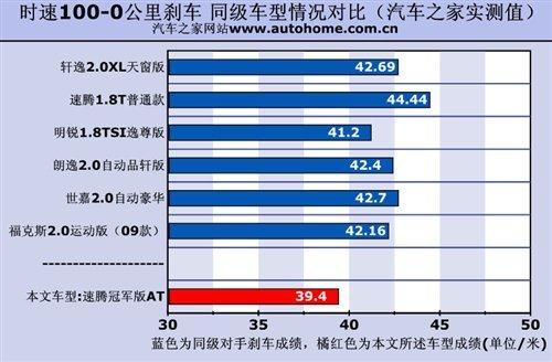 剛才我們說過,如果沒有新的寬胎加盟,速騰冠軍版將沒有資格被列入本文推薦車型,因為之前我們測過的1.8T速騰的剎車成績遠達44.48米,這雖然在合格范圍內,但對于一款強調性能的車型來說很難讓人滿意。而現在的速騰冠軍版在剎車系統不變的情況下,剎車距離大幅減小到39.4米,這個成績已經和奔馳S500相差無幾了。不過冠軍版懸掛和普通版本并沒有區別,所以在全力剎車是點頭現象還是無可避免的。