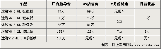 筆者從進口大眾經(jīng)銷商處了解到,相比2月份途銳的優(yōu)惠幅度,目前優(yōu)惠有進一步加大,其中途銳V6三款車優(yōu)惠現(xiàn)金5萬元,而途銳4.2L頂級版則優(yōu)惠9萬元現(xiàn)金,比上月優(yōu)惠幅度均增加2萬元。但據(jù)4S店銷售人員介紹,目前3.6標準版和6.0頂級版尚沒有現(xiàn)車,其他各款有黑色和銀色可選擇,但數(shù)量非常少。在內(nèi)飾顏色方面,途銳有米黃色、灰色、黑色和棕色四款可供選擇,而一般大眾顏色為米黃和灰色。近期,途銳將有部分新車到店,消費者可到4S店看車試駕。