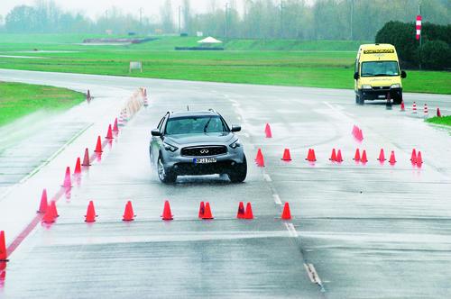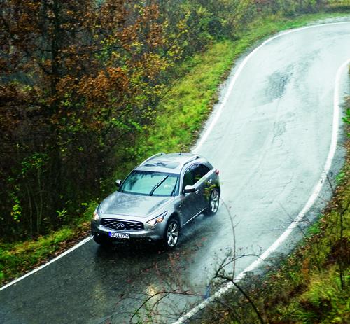 高速公路更適合FX37S的發揮,車子的隔音性很好,不過CDC主動式懸架似乎在模仿跑車效果。FX37S在瀝青路的抓地作用很強,給21英寸輪轂有力的支持,而且幾乎沒有車身晃動。另外,及時有力的轉向可與轎跑車媲美,為車子的操控性作出了很多貢獻?傊,在公路上,英菲尼迪FX37S快速、安全、有樂趣,但如果要在雪地駕駛,我們建議小號輪轂和冬季輪胎。通常情況下,FX37S采用后輪驅動,一旦輪胎打滑,扭矩將通過中央離合器給前輪分配扭矩,前輪最大比例可獲得50%的輸出扭矩。