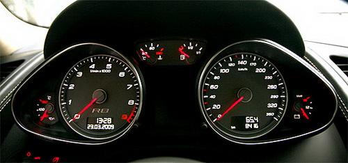 儀表板內,轉速表與時速表表底分別為9,000rpm與 350km/h,顯現R8傲人的性能實力;除了基本的油量表與水溫表外,電壓表和機油溫度表等輔助儀表,也是常見性能車型的儀表組合。