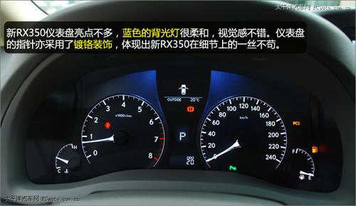 相對于充滿驚喜的方向盤,新RX350儀表盤的亮點并不多,藍瑟的背光燈很柔和,視覺感不錯。值得一提的是儀表盤的指針亦采用了鍍鉻裝飾,體現出新RX350在細節上的一絲不茍。