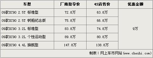 據沃爾沃經銷商處銷售人員介紹,目前店內的09款XC90車型全系都有9萬元的現金優惠,并且此次優惠活動截止到7月1日。經優惠后,2.5T標準型的售價跌破70萬元,僅售63.8萬元。2.5T 帆船紀念版經9萬元優惠后,售價從75.8萬元下降到了66.8萬元。兩款3.2L排量車型經優惠后售價降為74.8萬元及80.8萬元,頂配的4.4L旗艦車型售價降為了138.8萬元。銷售人員還介紹,XC90全系車型齊全,消費者挑選的空間較大。