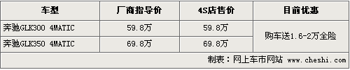 筆者從奔馳北京地區經銷商處了解到,現在消費者購買奔馳GLK系列已經不需要再加價,購車同時4S店可以贈送1.6萬-2萬元不等的全車保險,但是GLK兩款車在價格上還沒有出現優惠幅度。現在店內有銀色,白色等現車供應,內飾有米色和灰色兩款可供選擇。