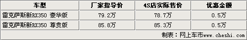 據北京雷克薩斯4S店銷售人員介紹,目前各4S店均有新RX350的現車銷售,而且貨源相對比較充足。現在購車在可以得到5000元的現金優惠還,還可以得到商家贈送的簡單裝飾。銷售人員還表示,新款RX350由于原裝進口車型,所以車型的手續還有到店。消費者在購車后還需要等待10個工作日左右才可以上牌。