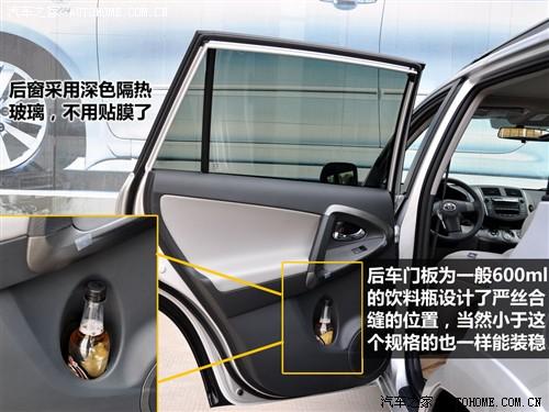 說RAV4的儲物功能,要從頭說起。遵循先左后右的習慣,我們就從左前車門說起。前車門有儲物格是很平常的,不過除此以外,RAV4為我們經常會喝的600ml規格飲料設計了很妥貼的位置。后車門沒有其他儲物功能,但只有這一個放飲料瓶的位置就足夠貼心了,因為確實不是擺樣子的,非常實用。