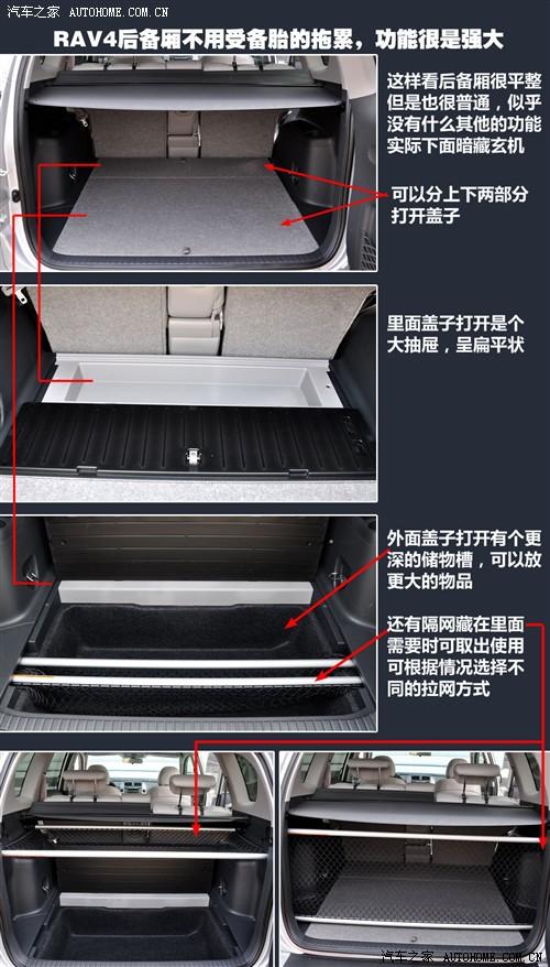 最強大的是RAV4的后備廂,首先側開的尾門本身就比較方便,只是針對關面我們提到過的車門鉸鏈強度問題后續還要進行關注。后備廂非常平坦,得益于備胎外掛的形式,儲物能力也非常強。地板可以分兩部分打開,靠里面的打開是類似一個抽屜的儲物格,靠外面的則是比較深的一個大儲物槽,同時還有隔離網袋可以取出來用,分兩種方式掛在廂壁上的掛鉤上,將后備廂分隔開來,方便固定物品。