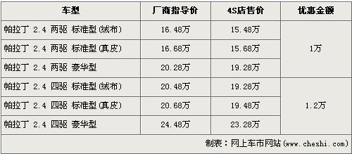 據(jù)4s店銷售人員介紹,帕拉丁兩驅(qū)車型的優(yōu)惠金額為1萬元,四驅(qū)車型的優(yōu)惠金額為1.2萬元。帕拉丁排量為2.4L,車系分為前置后驅(qū)和前置四驅(qū)兩種驅(qū)動(dòng)形式,每種驅(qū)動(dòng)形式中又分為標(biāo)準(zhǔn)版及豪華版,標(biāo)準(zhǔn)版分為絨布座椅或真皮座椅。絨布座椅全系最低配的帕拉丁 2.4兩驅(qū)標(biāo)準(zhǔn)版經(jīng)優(yōu)惠后售價(jià)降為15.48萬元,而操縱性能更加穩(wěn)健,全系最高配的帕拉丁 2.4四驅(qū)豪華版經(jīng)優(yōu)惠后售價(jià)也降到了23.28萬元。目前帕拉丁兩驅(qū)與四驅(qū)的豪華車型均無現(xiàn)車,欲購買的消費(fèi)者需交訂金1萬元,兩周后可提車。