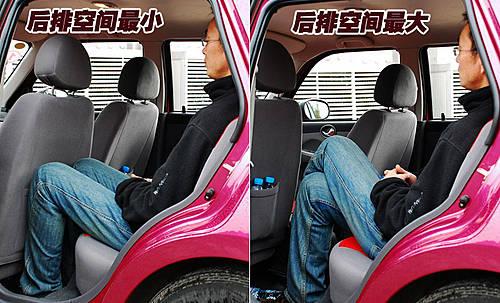 力帆320在內部空間表現最好的應該是后排的腿部空間,從圖中可以看的出來。將前排座椅調到最后,使后排達到最小的腿部空間,這時坐在后排的乘客也不會感覺太多緊促感。而當后排的腿部空間最大的時候,后排乘客的乘坐舒適性更加優秀,寬大的空間讓人很難相信這是一款微型轎車。