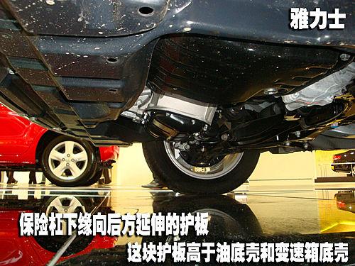 廣豐并未給雅力士提供發動機下側護板,在其底部我們可以清楚的看到發動機油底殼和變速箱油底殼這兩項比較容易在“托底”中出現損傷的部件。不過位于前保險杠后方的延長護板更高于發動機油底殼和變速箱油底殼,因此也能夠起到一定的輔助保護作用。