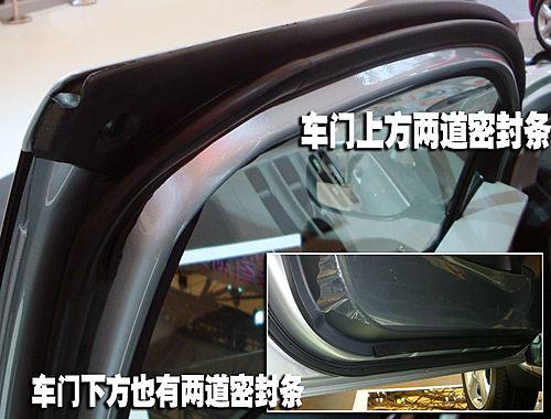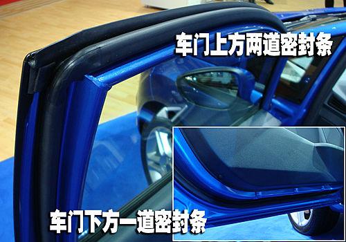 新嘉年華在車門上方提供了兩道密封、車門下方為一道密封,同樣的在車身門框的位置也提供了一圈密封條。不過記者仔細觀察卻發現新嘉年華的密封條質地比較柔軟,并且這臺展車已經出現了一些扭曲的現象。