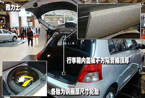 我們看到豐田雅力士的行李箱與備胎之間的蓋板上設(shè)計(jì)了非常厚的一層隔音材料,并且備胎兩側(cè)的工具箱都是做工非常精良的塑料材質(zhì)整體上看非常整齊美觀。
