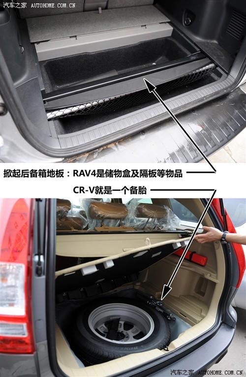 先開后備箱地板之后,對比也是明顯的,CR-V一個赤裸裸的備胎完全占領了地板下空間,RAV4比較體貼的設計了儲物盒等諸多空間。